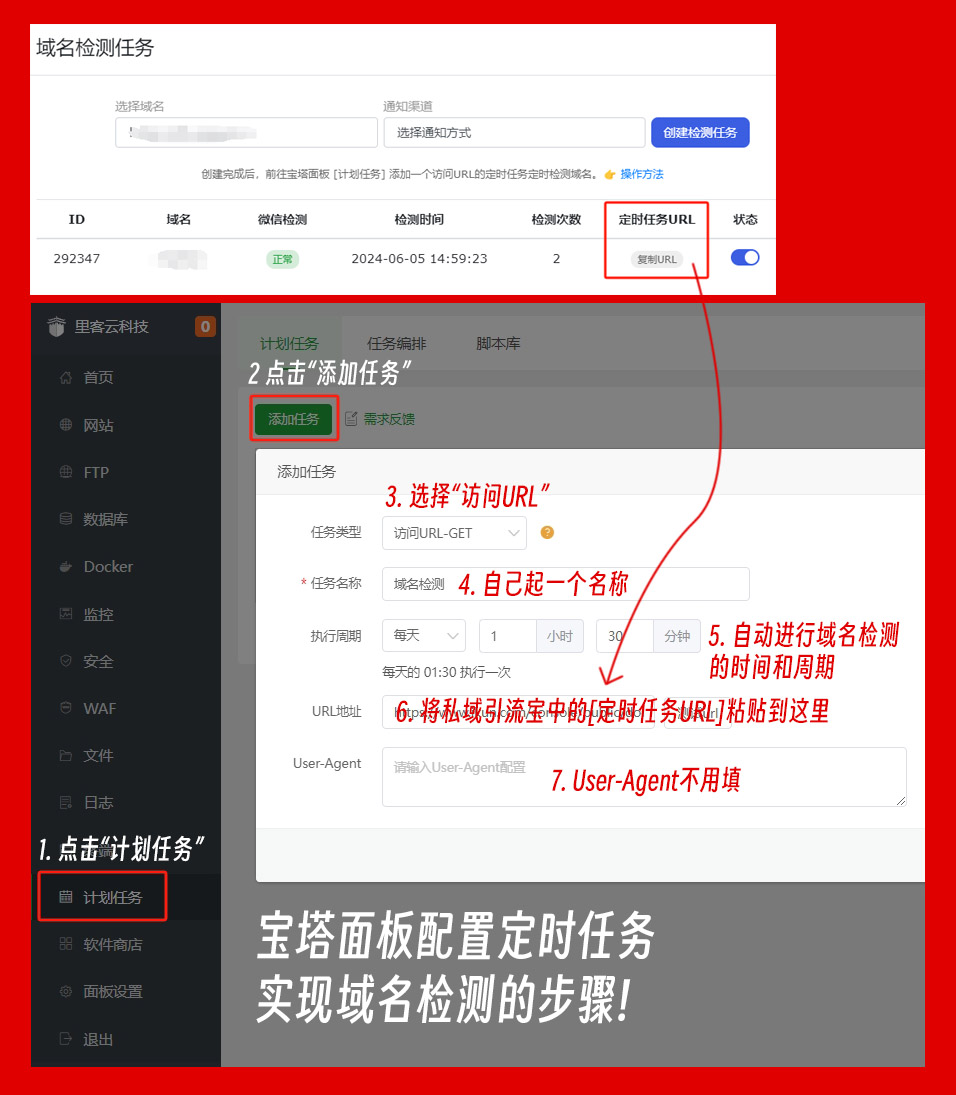 创建完成后,前往宝塔面板 [计划任务] 添加一个访问URL的定时任务定时检测域名。👉 操作方法